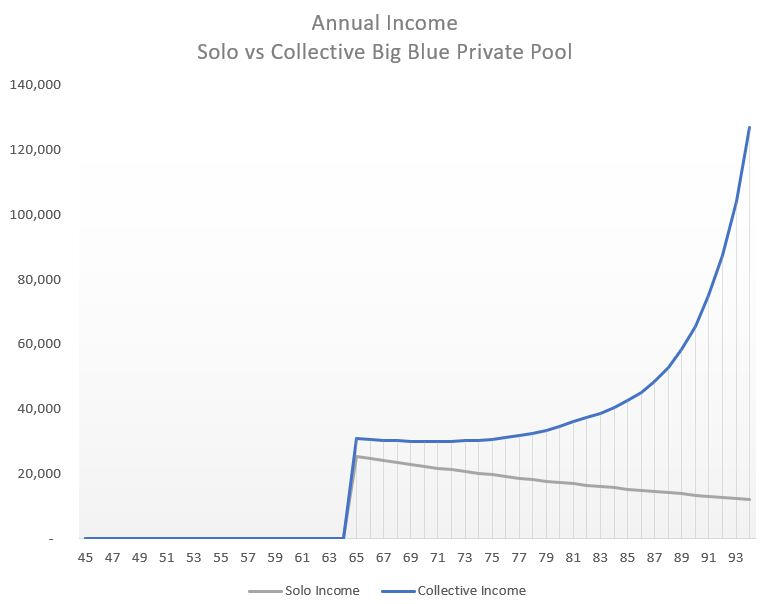 Our digital platform allows you to invest, accumulate and receive income for the rest of your life with a cohort of similarly minded savers.Through our app you will be able to make a one-time purchase of a share in a collective trust. You can then monitor your share and its value alongside the value of the entire trust in the app.At age 65 you will begin to receive payments directly through our app and into your bank account. These payments will continue for the rest of your life and will grow with time.When there is 10% of the cohort remaining, the trust will be automatically terminated and one final payment will be made to surviving members.